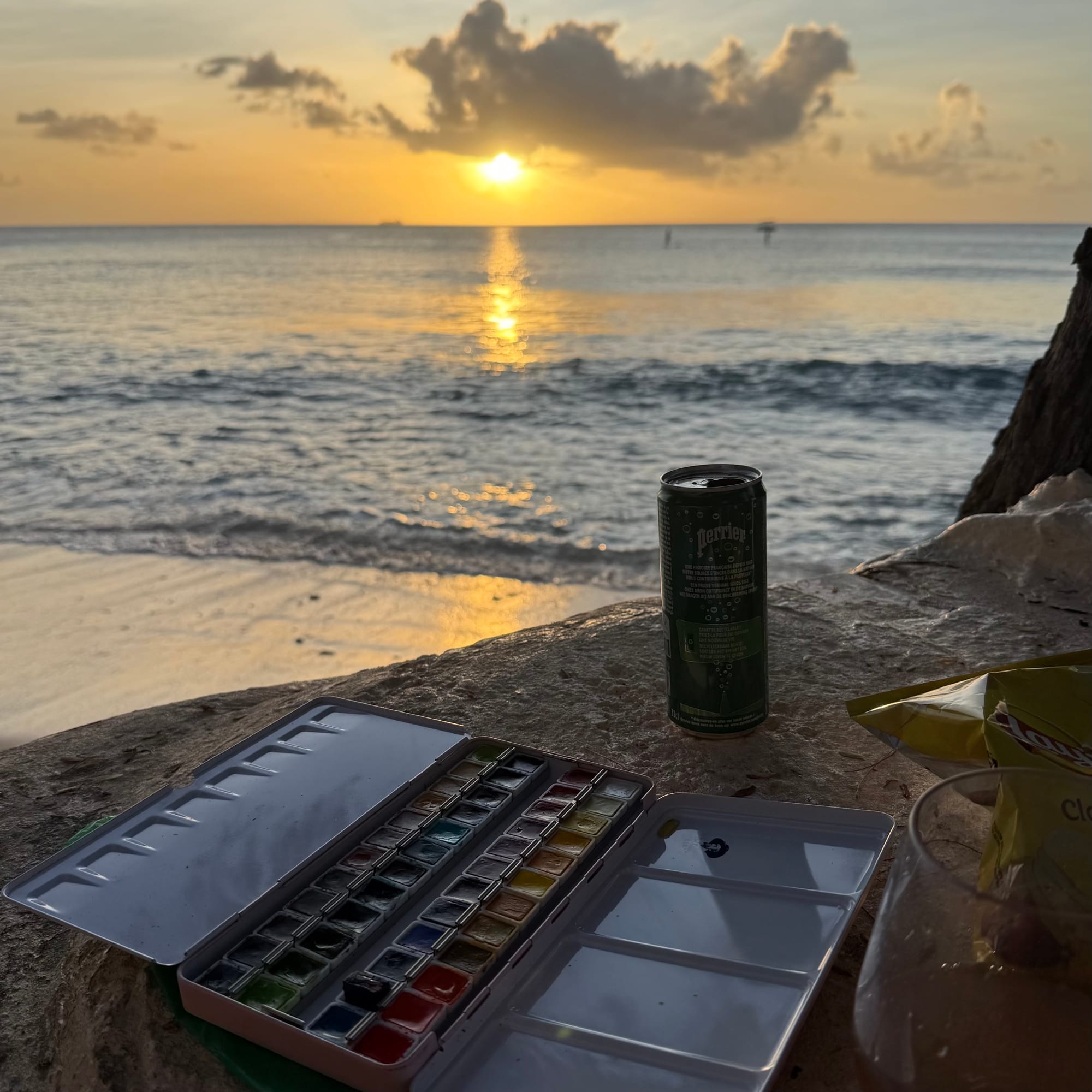 We left New York wrapped in snow and boarded a plane that felt like a promise. Rockaway slipped by, the city receded, and suddenly we were landing somewhere warm, familiar, and quietly reassuring. The first walk led us along the beach to the grocery store — a small ritual we seem to repeat every time. Our beach was right there, unchanged. Indoors, everything turned turquoise and calm. Evening arrived without drama. Feet in the sand, the water breathing nearby, colors deepening by the minute. By sunset, brushes came out, the sky doing what it always does here: reminding us why we return.