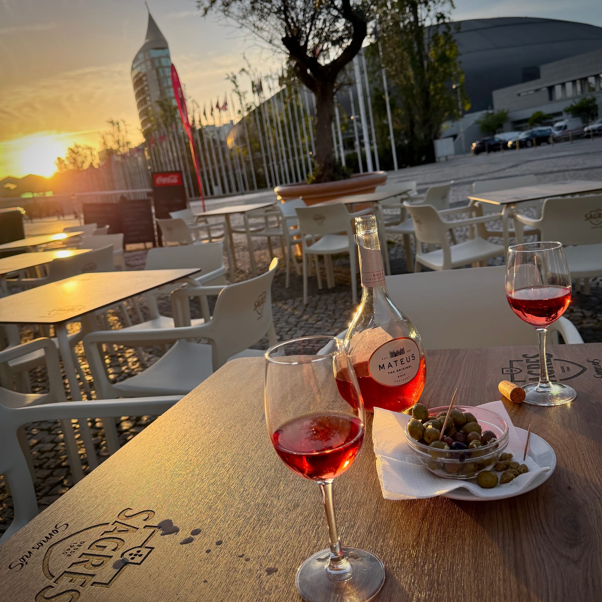 With our feet firmly on the ground again, we set out for one of the many small international restaurants and “imbiss” spots, and not far from the Expo mascot, enjoyed the glorious sunset with a glass of wine and some excellent olives.