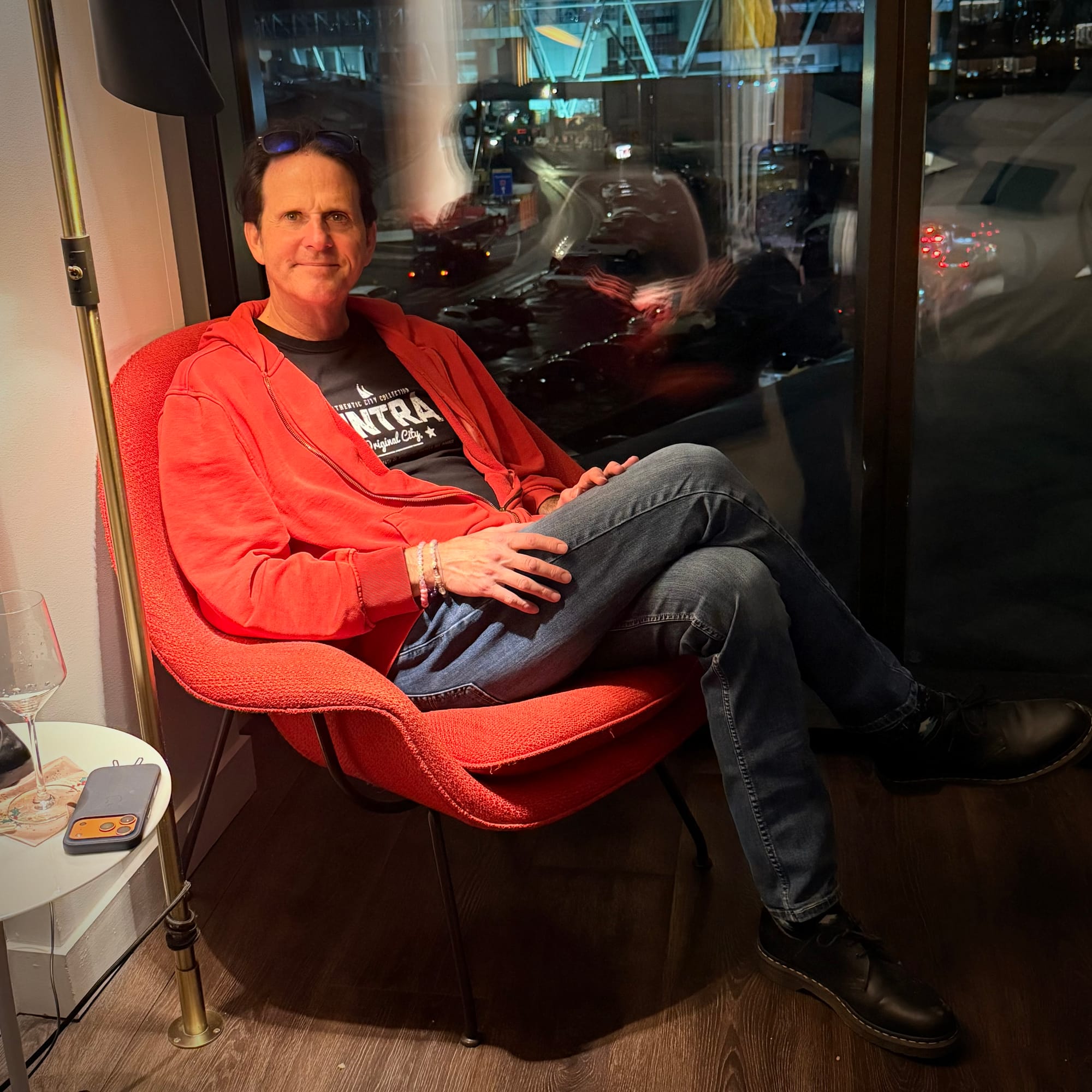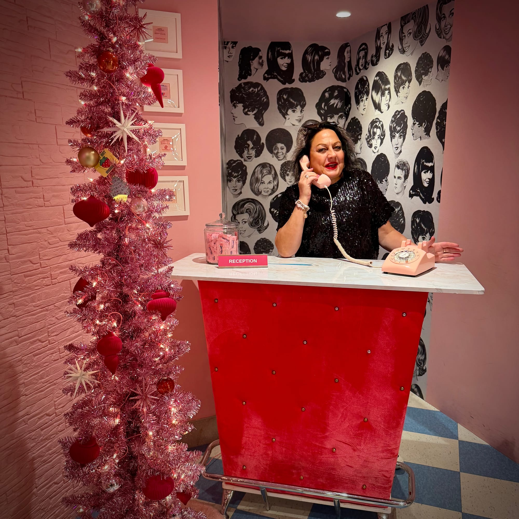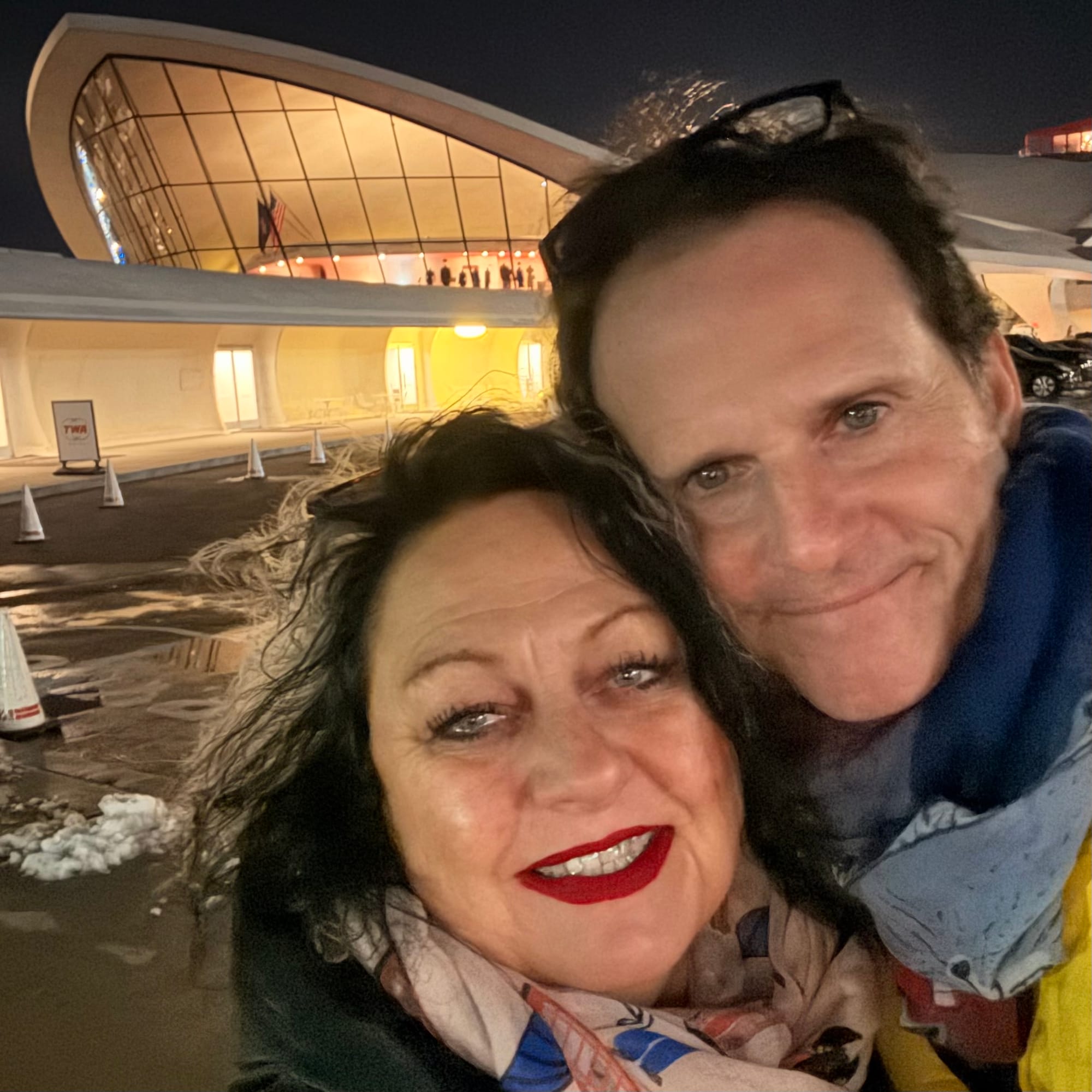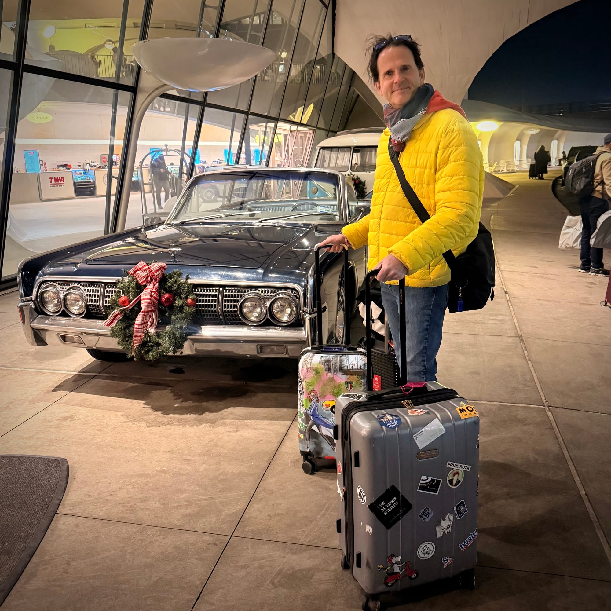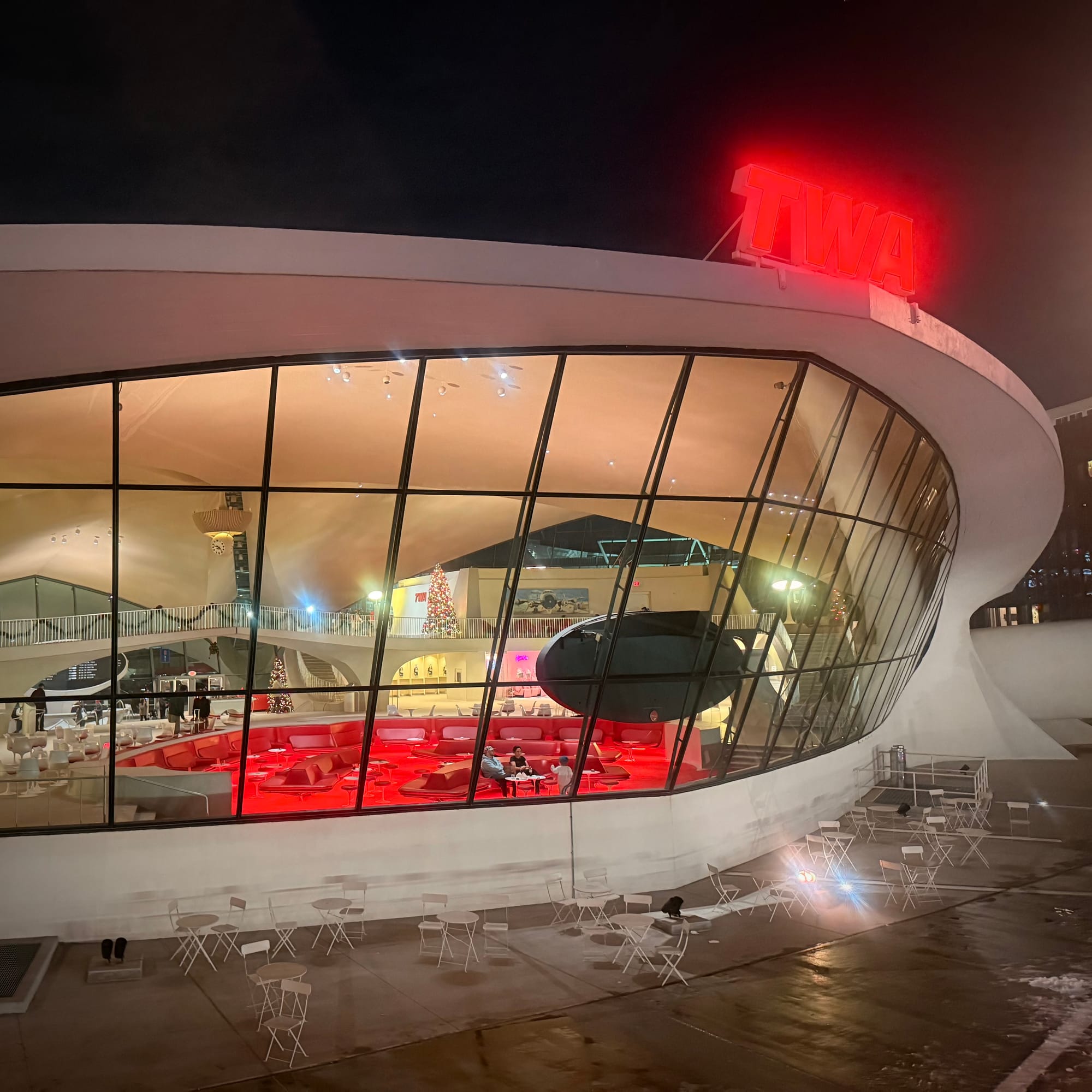 This time, I put a bit more thought into what to wear, trying to match the hotel’s unmistakable 1960s jet-set vibe. Quite frankly, my yellow dress back then clashed spectacularly with all the glorious red on display at the TWA. I even had a little silk scarf planned — tied around my neck for that extra air-travel glamour — but, alas, I forgot it and had to do without.